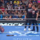 The ref reprimands but Cash bails out. Now Cash grabs a chair and brings it over! But Christian snatches that, too! Cash wants Christian to show mercy, but then Stoke grabs the chair?! Christian SHOVES Stoke into the post, but then Cash POSTS Christian! Cash TOSSES Christian into the timekeeper’s area! Cash calls to Dax, they regroup, and they have Cope all to themselves! The fans cheer Cope on, and Cope stands up to throw hands! The fans fire up as Cope fights 2v1, but then he slows down! Dax kicks low, then he and Cash fire SUPERKICK after SUPERKICK, taunting The Young Bucks, too! DOUBLE SUPERKICKS!