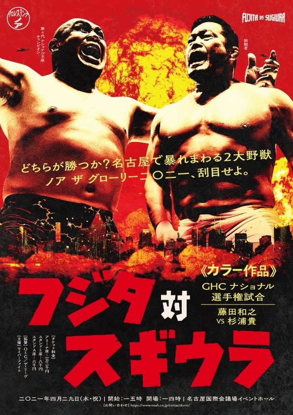 ~ NOAH have created a Showa Era monster movie theme for Takashi Sugiura vs Kazushi Sakuraba. Fans are reminded of Kong vs Godzilla, with DDT\NOAH President, Sanshiro Takagi, saying it reminds him more of Sanda vs Gaira.